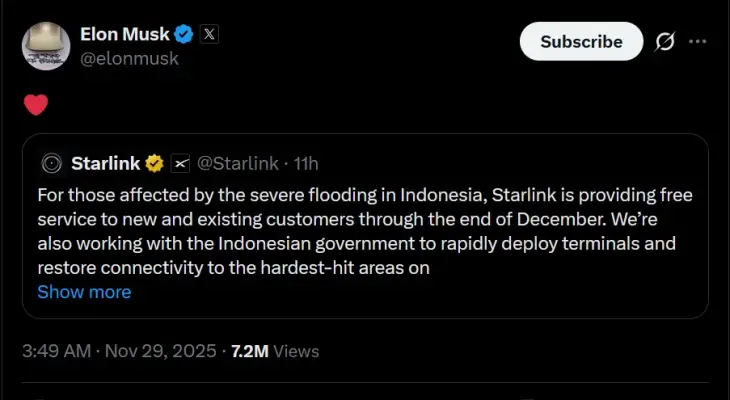 SpaceX, through its Starlink service, has announced 30 days of free internet access for all customers affected by the severe floods in the Sumatra region. The policy is implemented as a form of support to ensure that residents in disaster-hit areas can remain connected even as conventional telecommunications networks suffer damage.
