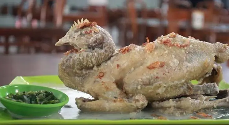In ancient times, this dish was usually served at death ceremonies. The rooster whose position is bowed is a symbol of the family who kneel down to ask forgiveness for the sins of those who have died. While the head of a rooster that is turned looking back is a symbol of humans to always remember everything they have lived and be grateful for what they have.