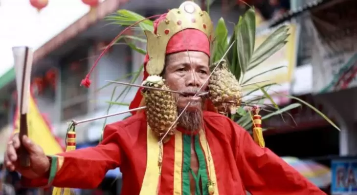 Accompanied by drums, participants in the Tatung Singkawang Parade wore glittering costumes of the greatness of the Dayak Tribe and China in the past. The Tatung attraction is filled with mystical and thrilling things. For example, there is a Tatung standing upright on a stretcher, setting foot on a blade or knife. There are also those who stick pointed steel wires into the right cheek until they penetrate the left cheek.