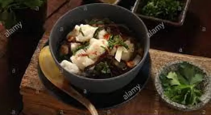 The broth is usually fish or shrimp-based, and mushrooms, dried lily flowers, slices of jicama, garlic, and scallions are subsequently added and served with tekwan.