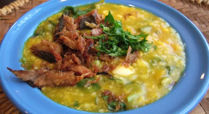 In one serving of tinutuan porridge there are a variety of fresh vegetables. Call it kale, spinach, basil, shelled corn, sweet potatoes, and pumpkin. As a complement, usually there will be skipjack or minced beef sprinkled on top of the porridge.