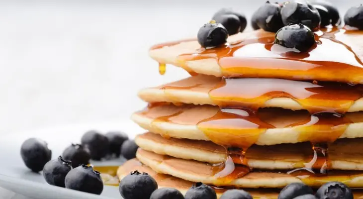 Pancakes are round, thin, and flat omelettes, which are made from flour, chicken eggs, sugar, milk, ingredients mixed with water to form a thick dough and cooked on a hot skillet. Usually, pancakes are enjoyed warm with butter, maple syrup, honey, spread of whipped cream and pieces of fresh fruit. Can also be with eggs, bacon, and ham.