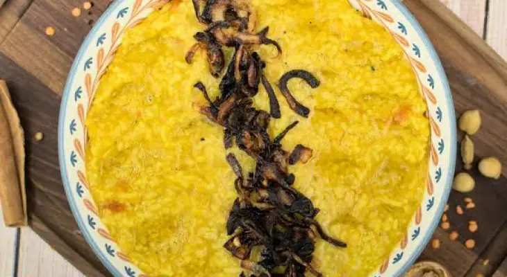 Madrouba is Qatari porridge with various spices in it and usually accompanied by chicken. Made from cooked rice that is pounded into porridge, and uses many spices such as turmeric, cumin, cardamom, ginger, cloves, cinnamon, garlic and black pepper.