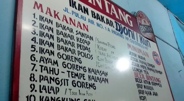 Want to eat seafood with your family? Try the Djoni/kun Grilled Fish which is located at Pulau Air Street, Number 1A, Pondok Pondok, West Padang, Padang City. The benchmark is near the Yellow Bridge, in the Chinatown area of Padang City.