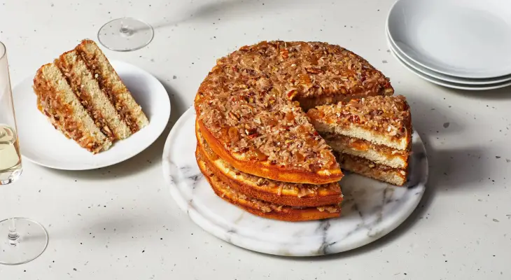 Lane cake is a sponge cake filled with a combination of coconut, custard, raisins, and bourbon . To make it look more attractive, the top is given smooth frosting .