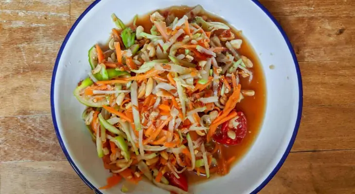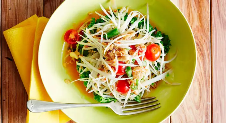 According to The Culture Trip , som tam is known as a spicy salad made from thinly sliced green papaya. The ingredients for making som tam consist of Thai chilies, fresh garlic, dried shrimp, fish sauce, sweet palm sugar, peanuts, lime, cherry tomatoes, green long beans, and green papaya. Green papaya was chosen because it will give a crunchy texture to the salad.