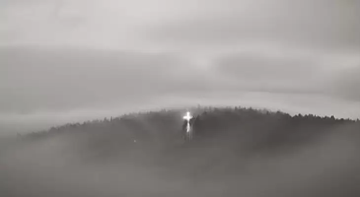 At the bottom, this cross is strut by three big pillars and symbolizes the Trinity.