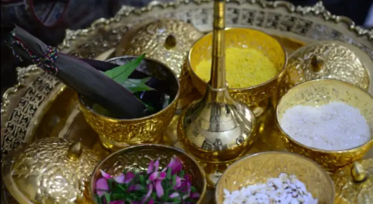 For example, turmeric rice symbolizes blessing. White rice symbolizes purity and puffed rice symbolizes prosperity. The flour water symbolizes the calming of heart while the grinded henna symbolizes harmony.